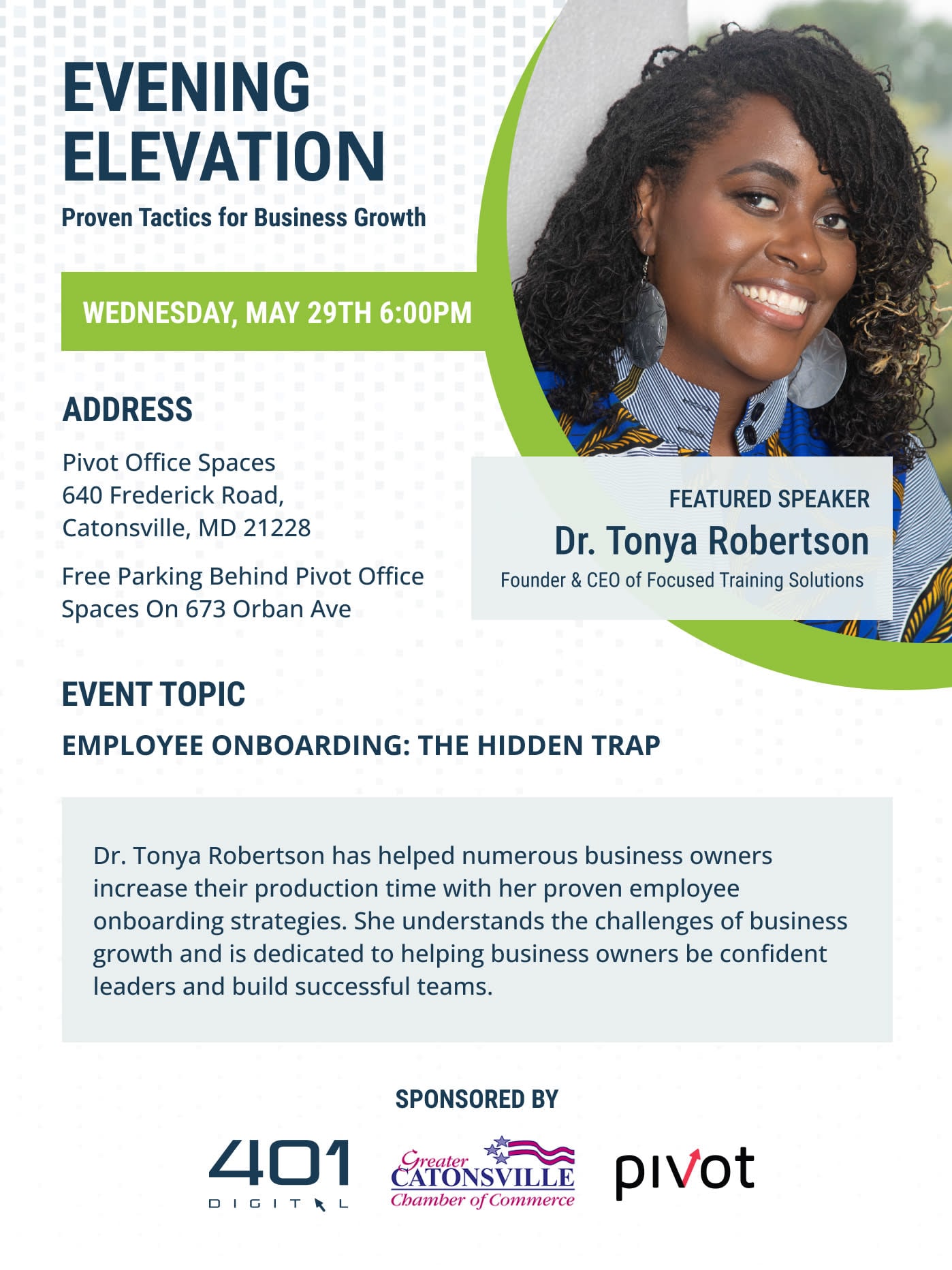 Topic: Employee Onboarding: The Hidden Trap When: Wednesday, May 29, 2024, from 6 pm to 7 pm at PIVOT Office Spaces, 640 Frederick Road, Catonsville, 21228